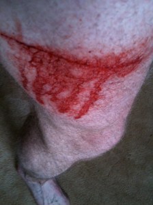 One of the things I like about trail running is that it often makes me bleed. Nothing terrible but it’s an odd week that I haven’t nicked something. A stick or a rock, maybe caught my hairy legs on a briar. And when I look down and see blood smeared on my skin, it makes me happy, I like the way it looks. Frankly, it makes me feel kind of tough.