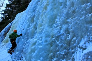 So this weekend, we headed up north for what he coined his “dream vacation”: A day of skiing at Attitash, followed by a day of ice climbing just outside of North Conway. In between, we swam in the hotel’s outdoor pool, he rolled in the snow before diving in. I went running and we sampled both Indian and Thai food with good results.